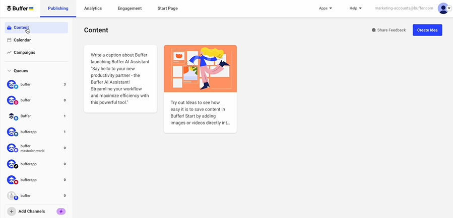 Buffer’s interface is simple, and it displays a queue of all social media postings that are currently scheduled. It’s simple as well as allows you to concentrate on what matters: your scheduled content.